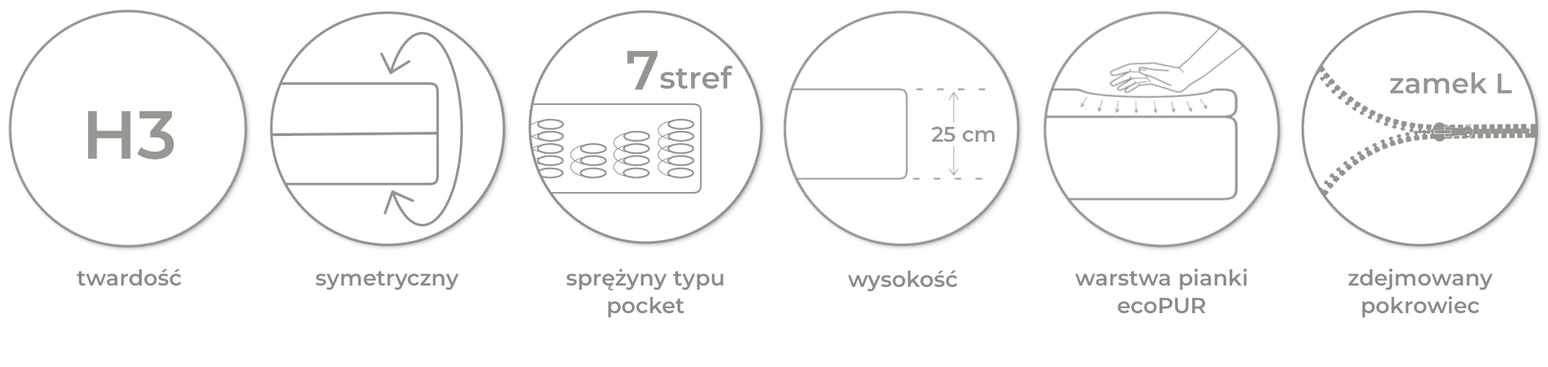 3. 7 strefowe sprężyny kieszeniowe (18 cm) podwójnie hartowane sprężyny kieszeniowe (pocket), umieszczone w oddzielnych kieszonkach i klejone punktowo, dzięki czemu każda sprężyna pracuje niezależnie. Zapewniają one prawidłowe podparcie ciała i równomierne rozłożenie ciężaru, a jednocześnie są sprężyste, wytrzymałe i bardzo dobrze wentylują materac, zwiększając komfort snu.