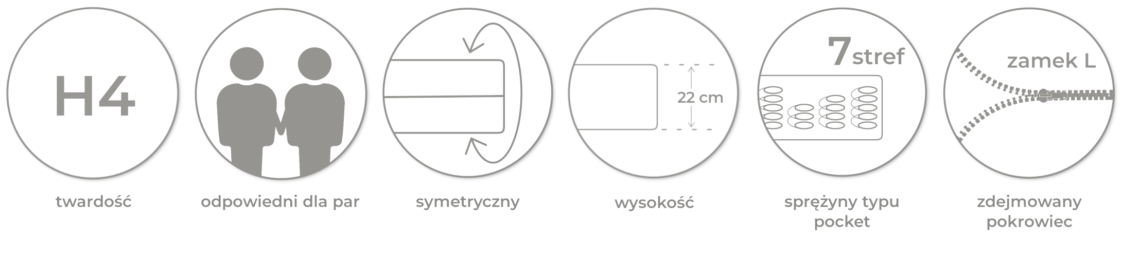 • Wysoka twardość H4 – zapewnia bardzo stabilne podparcie kręgosłupa, polecana osobom preferującym twarde spanie.