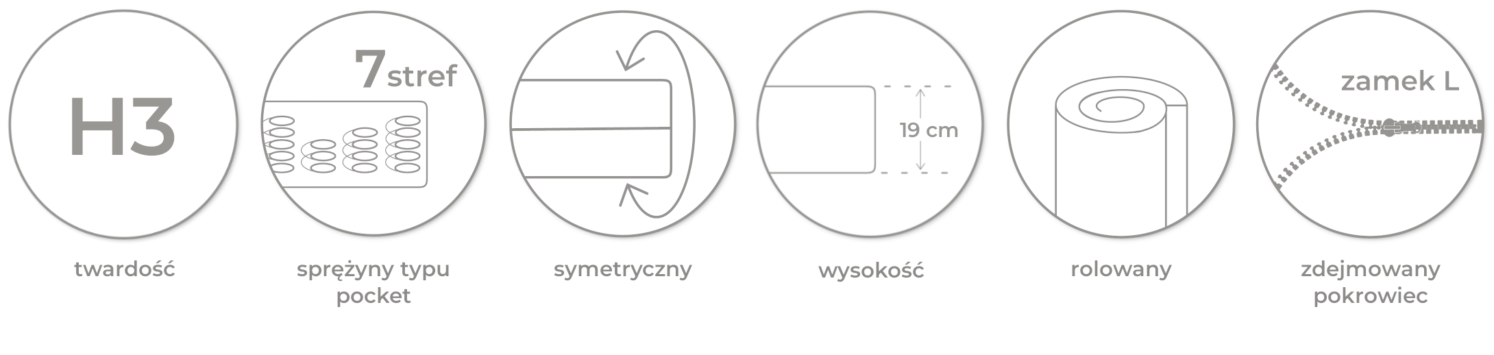 4. 7 strefowe sprężyny kieszeniowe (12 cm) sprężyny dzielą materac na 7 stref, każda o odpowiednim podparciu dla danej części ciała. Sprężyny umieszczone są w oddzielnych kieszeniach, wykonanych z tkaniny, dzięki czemu pracują zupełnie niezależnie od siebie – nacisk na jedną nie powoduje automatycznego ugięcia drugiej. Materac jest cichy, idealnie dopasowuje się do kształtu ciała. Obracanie i wiercenie się na łóżku drugiej osoby,nie będzie wyczuwalne. Nie ma znaczenia różnica wagi osób korzystających, ponieważ dzięki sprężynom pocketowym nie powstaje pochylenie materaca, czy też wgłębienie wokół osoby cięższej.