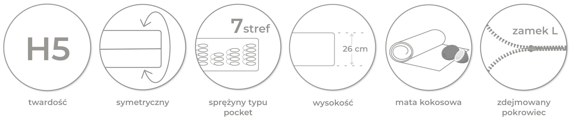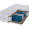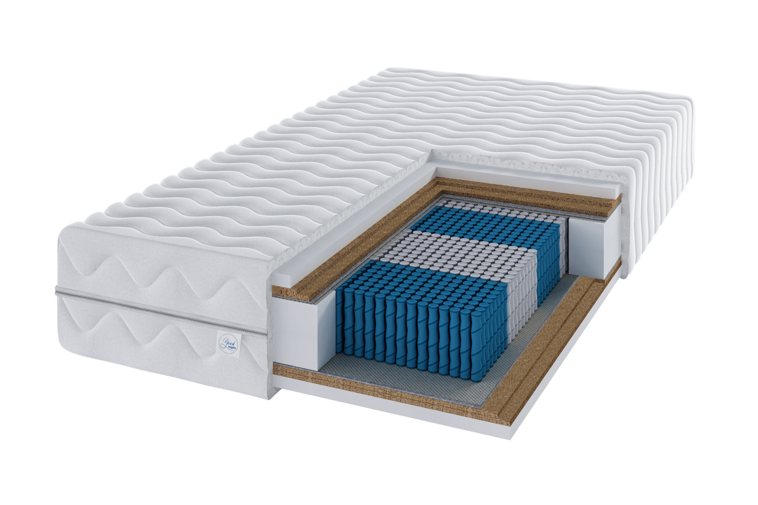 • Zwiększona trwałość materaca – kokos w połączeniu z gęstym układem sprężyn multipocket sprawia, że materac jest wyjątkowo odporny na zużycie i przez długi czas zachowuje swoje parametry